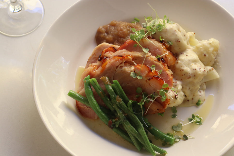 Glazed Christmas ham, cauliflower cheese, apple sauce & Christmas pudding to finish.